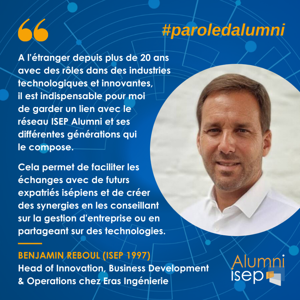 A l’étranger depuis plus de 20 ans avec des rôles dans des industries technologiques et innovantes, il est indispensable pour moi de garder un lien avec le réseau ISEP Alumni et ses différentes générations qui le compose.