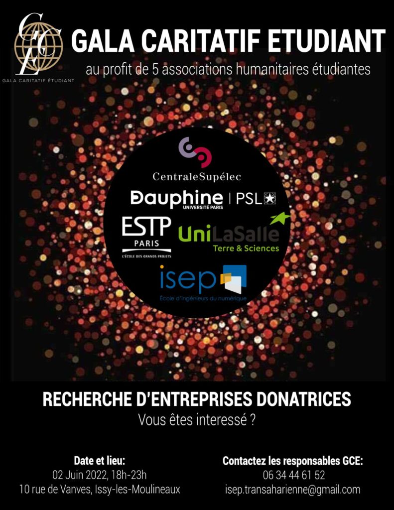Le Gala Caritatif Étudiant a pour objectif de créer une forte relation entre des entreprises et 5 associations étudiantes humanitaires des écoles de CentraleSupélec, et Paris-Dauphine, ESTP Paris, UniLaSalle et de l’ISEP – école d’ingénieurs du numérique.