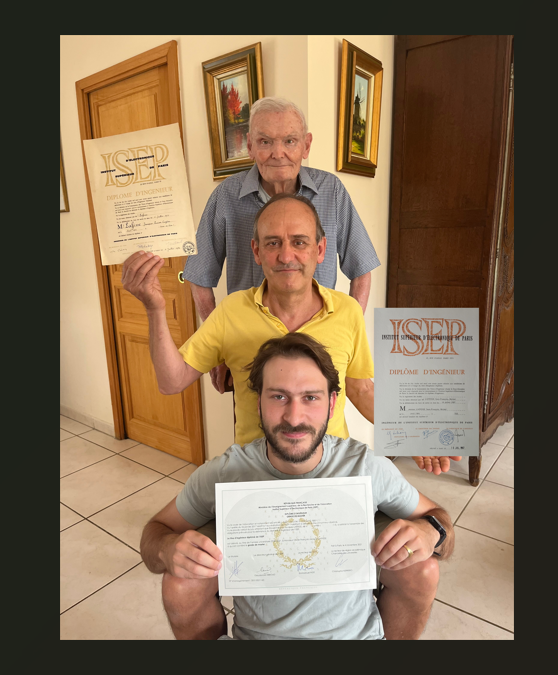En bas, son fils, Olivier Laffisse, promo 2021, a voulu intégrer l’Isep comme son père et son grand père, les deux ayant fait leur métier avec passion. Après 2 ans dans un société de sous traitance, il vient de se faire embaucher par une grande société qui devrait l’envoyer faire de nombreuses missions.