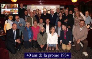 La promotion 1984 a célébré ses 40 ans en novembre 2024 à Paris : ce fut un beau succès avec 33 anciens sur place et 4 en visioconférence des 4 coins de la Terre, 54 participants avec les conjoints et surtout une très grande joie de se retrouver !