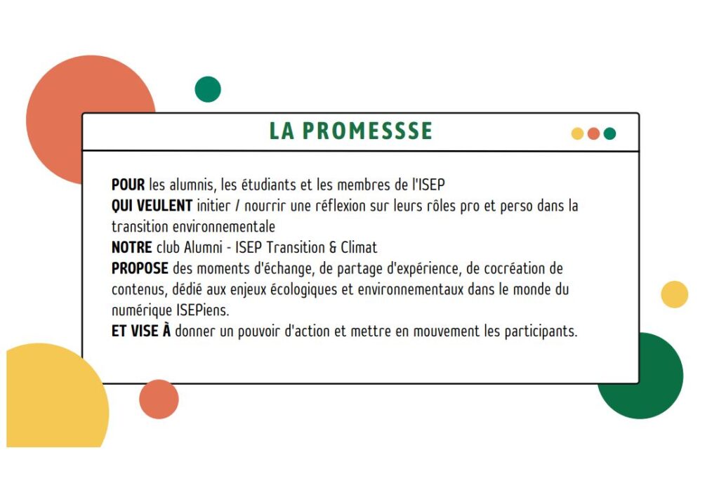 NOTRE club Alumni Isep Transition & Climat PROPOSE des moments d’échange, de partage d’expérience, de cocréation de contenus, dédié aux enjeux écologiques et environnementaux dans le monde du numérique Isepien.